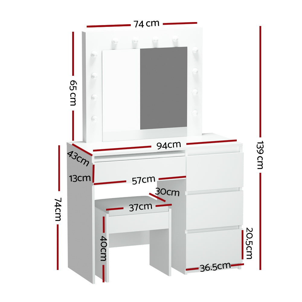 Add a touch of Hollywood glamour to your bedroom with the Manly Hollywood LED Dressing Table Set. Featuring a large illuminated mirror with 12 LED bulbs, you can adjust the brightness and choose from three light colours – neutral, warm, and daylight – for the perfect makeup lighting every time. Four spacious drawers provide ample storage for all your beauty essentials, while the soft PU leather padded stool ensures comfortable seating. Crafted from eco-friendly particle board and MDF with a durable melamine finish, this vanity is both sturdy and easy to maintain.